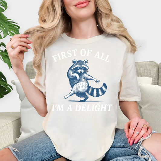 First of All I’m a Delight Raccoon T-Shirt – Funny Cute Graphic Tee