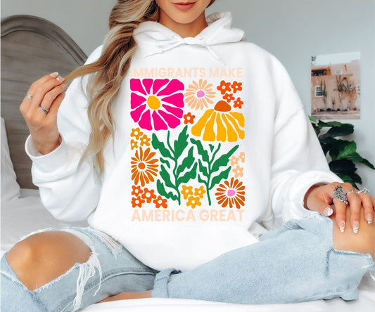 Immigrants Make America Great Hoodie - Retro Floral Graphic Hooded Sweatshirt, Colorful Boho Flower Power Pullover, Social Justice Statement Hoodie, Groovy Botanical Aesthetic Gift