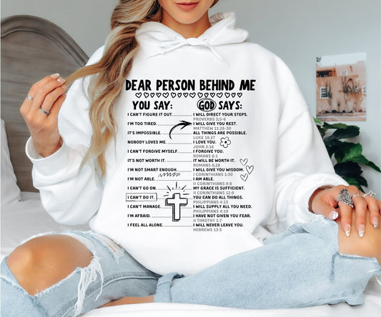 Dear Person Behind Me Christian Hoodie - You Say God Says Bible Verse Hooded Sweatshirt, Inspirational Scripture Pullover, Faith Mental Health Hoodie
