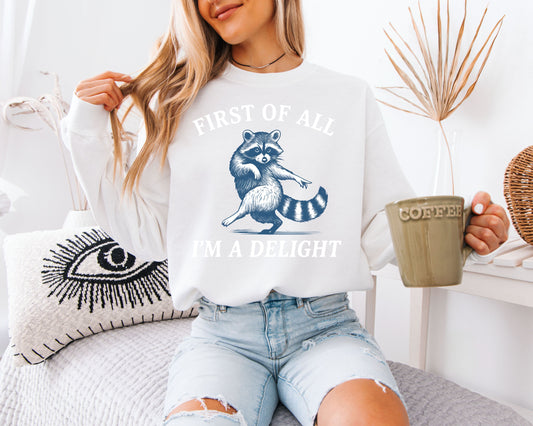 First of All I’m a Delight Raccoon Sweatshirt – Funny Cute Graphic Pullover