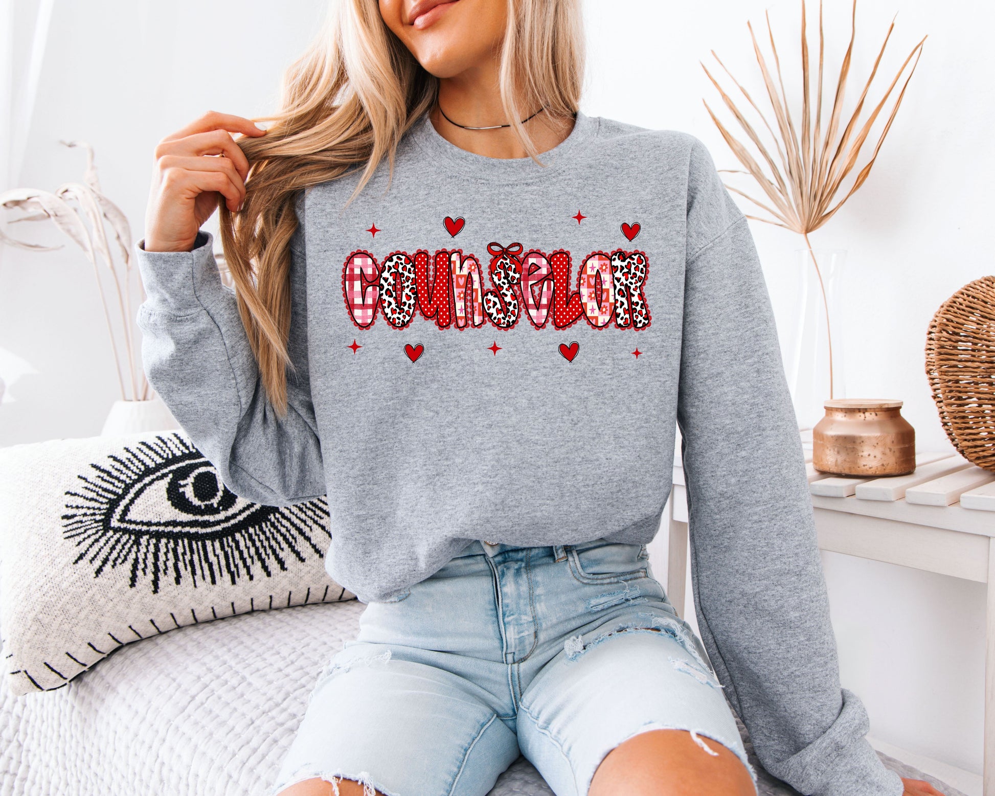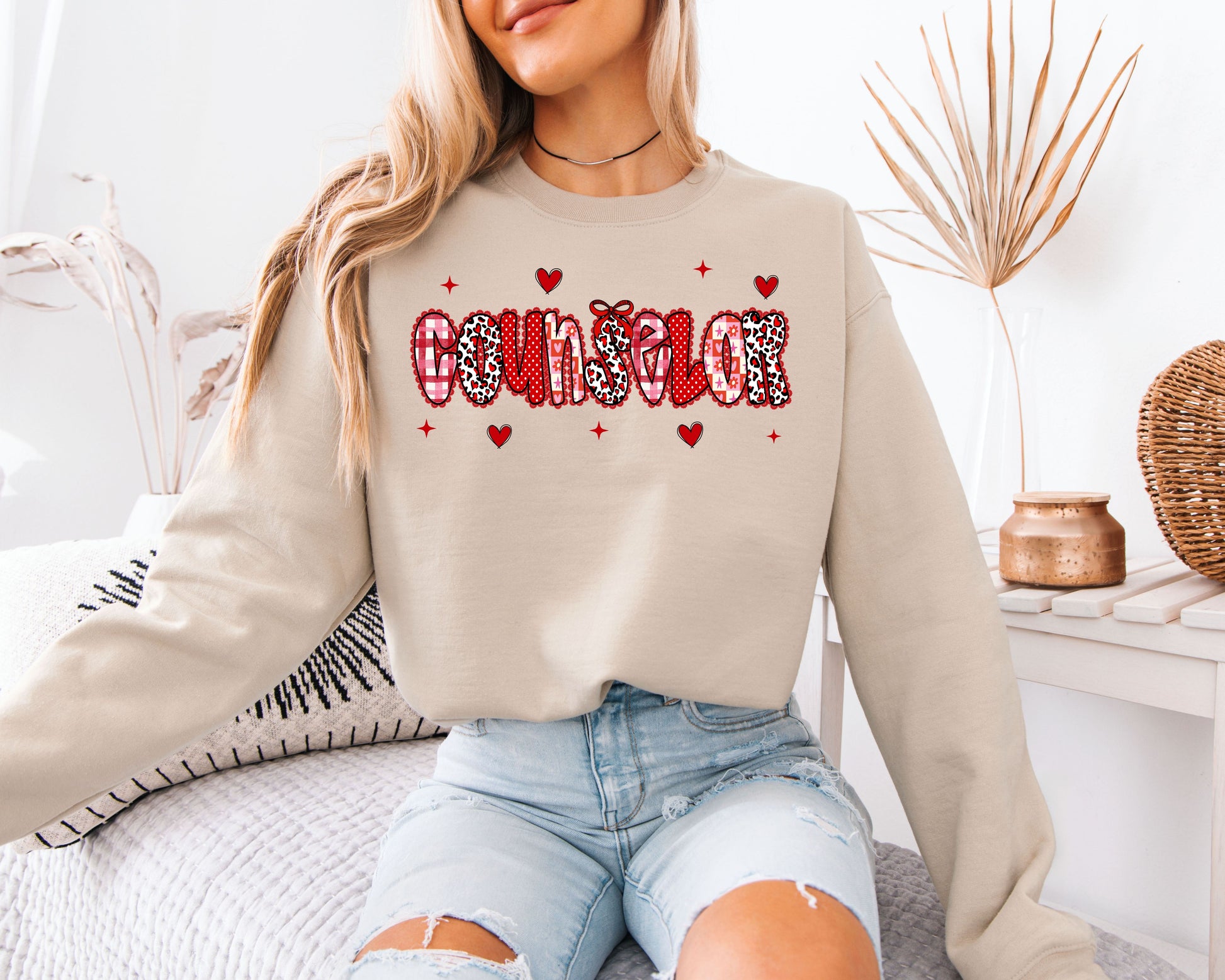 Celebrate the heart of the school with our Counselor Valentine’s Day Sweatshirt. This vibrant and trendy crewneck features the word "COUNSELOR" in bold block letters, each filled with a unique mix of festive patterns including red leopard print, checkerboard, hearts, and stars.