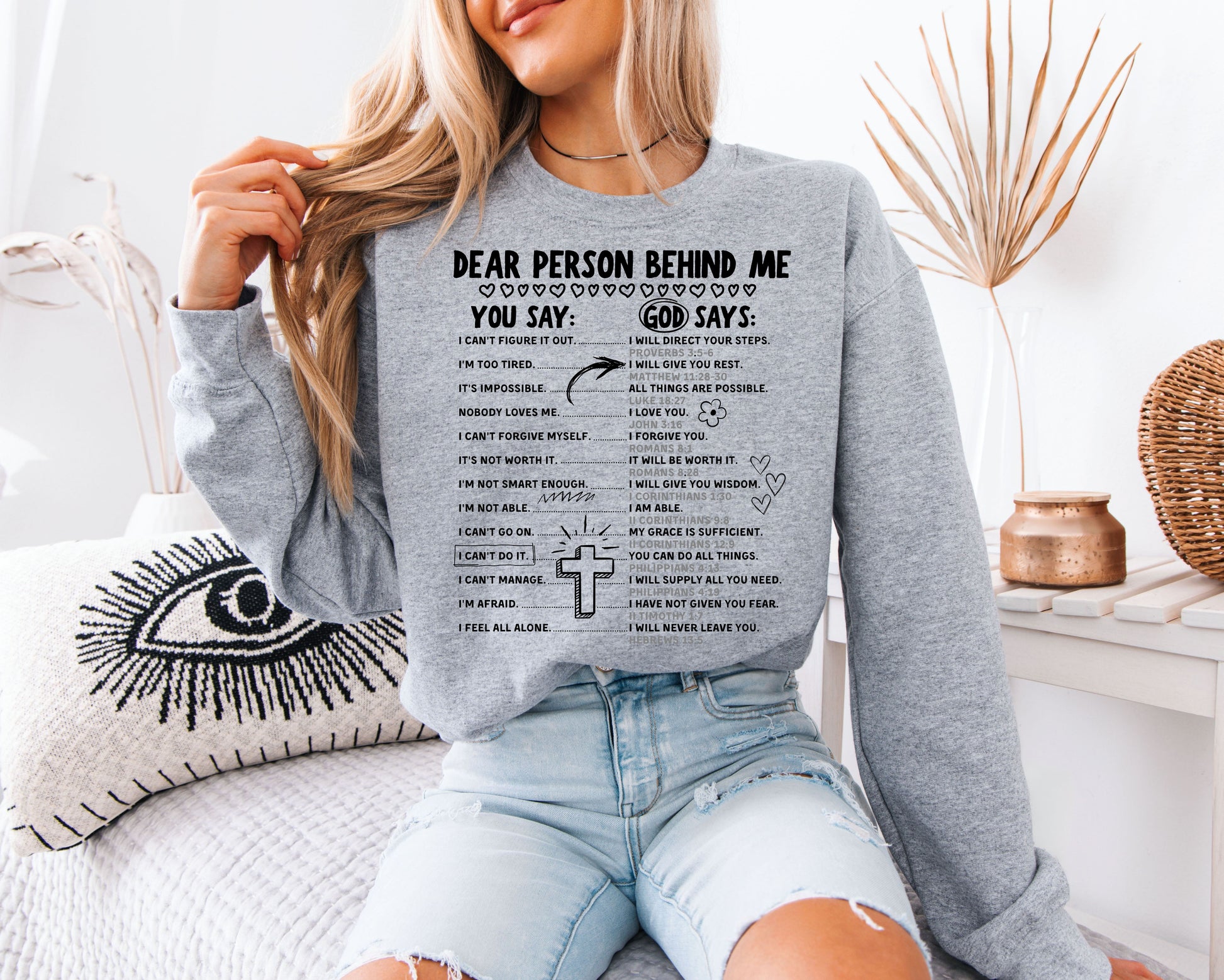 Dear Person Behind Me Christian Sweatshirt - You Say God Says Bible Verse Pullover, Inspirational Scripture Crewneck, Faith Mental Health Jumper