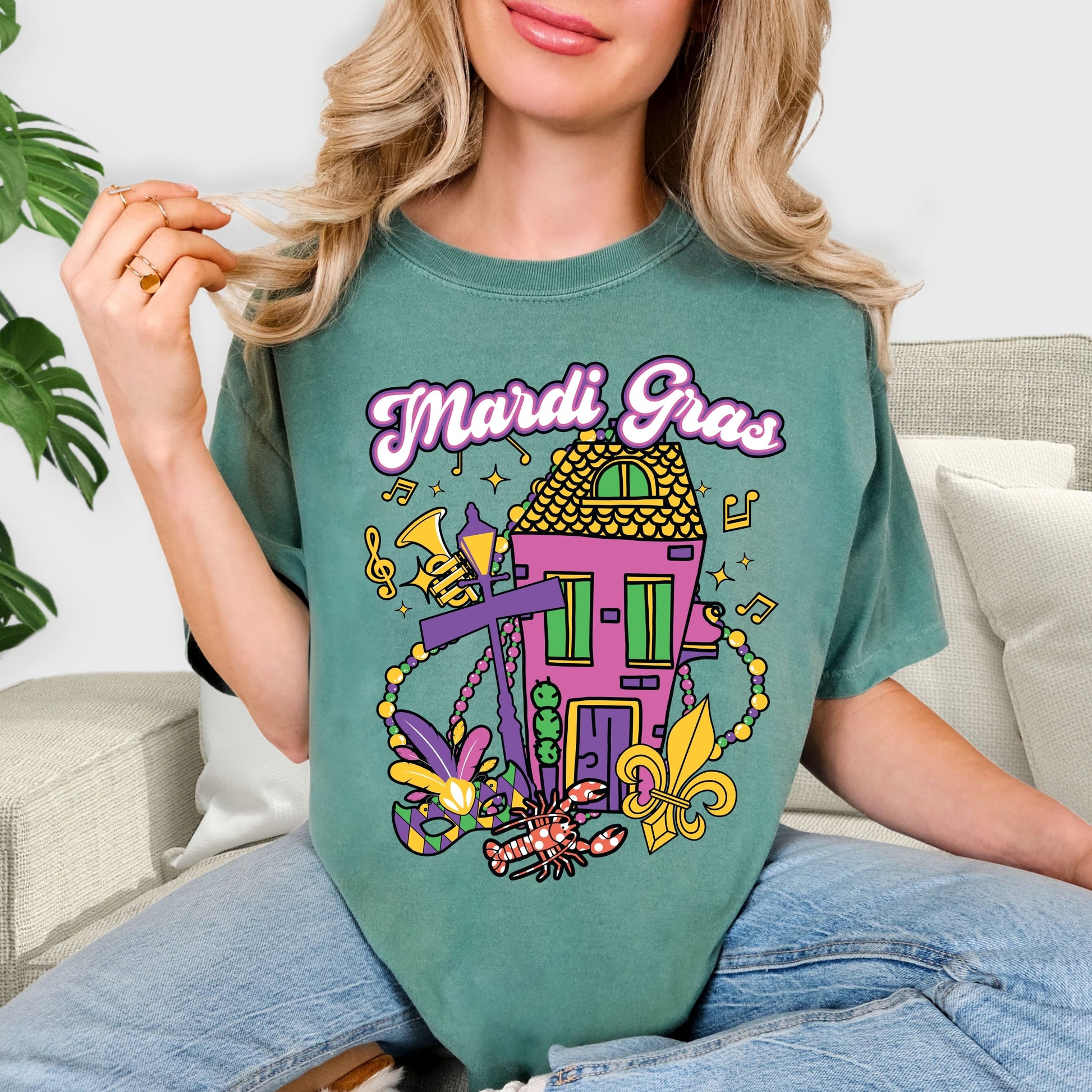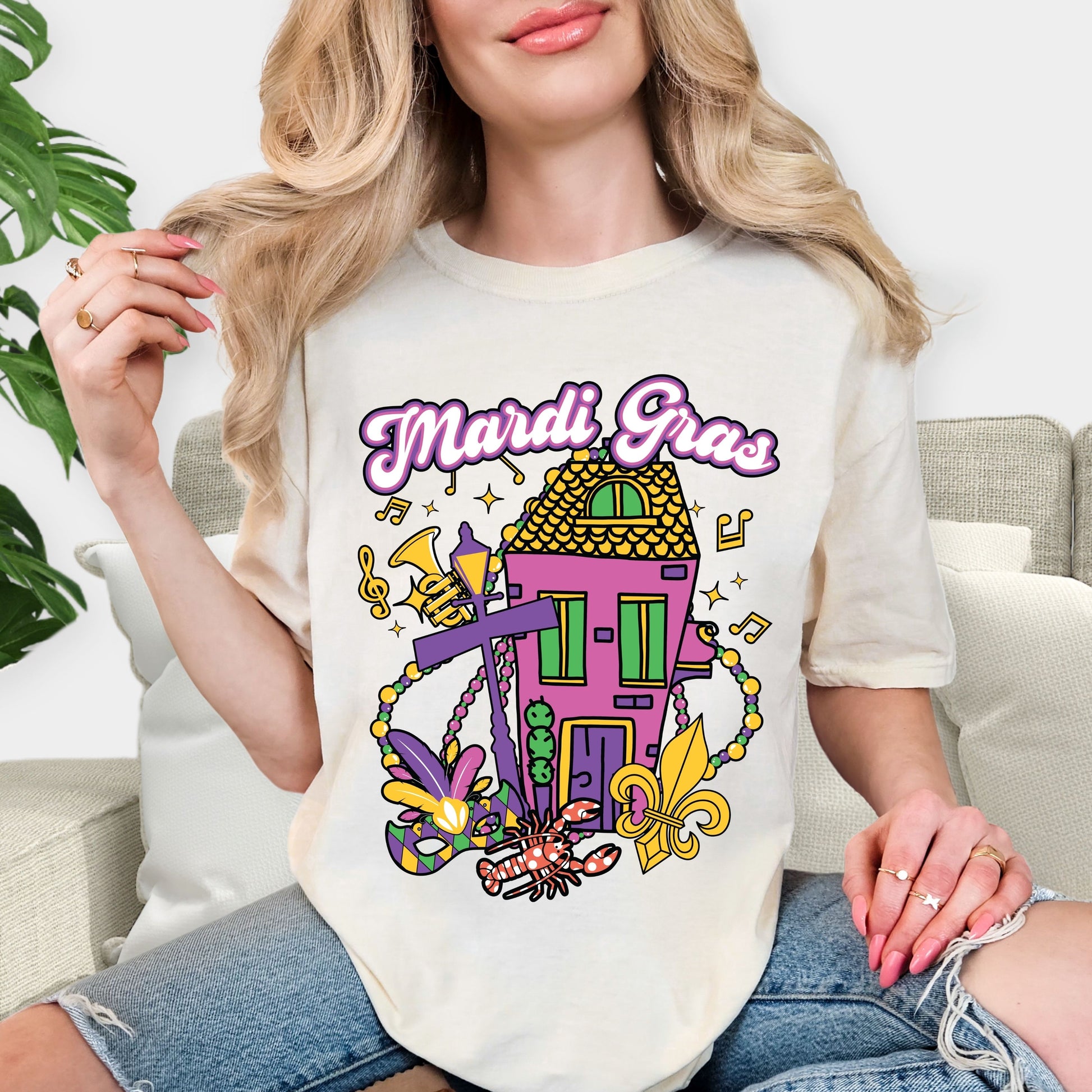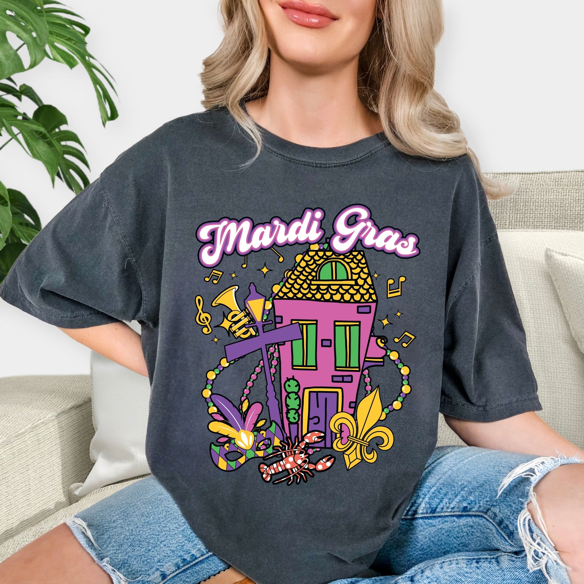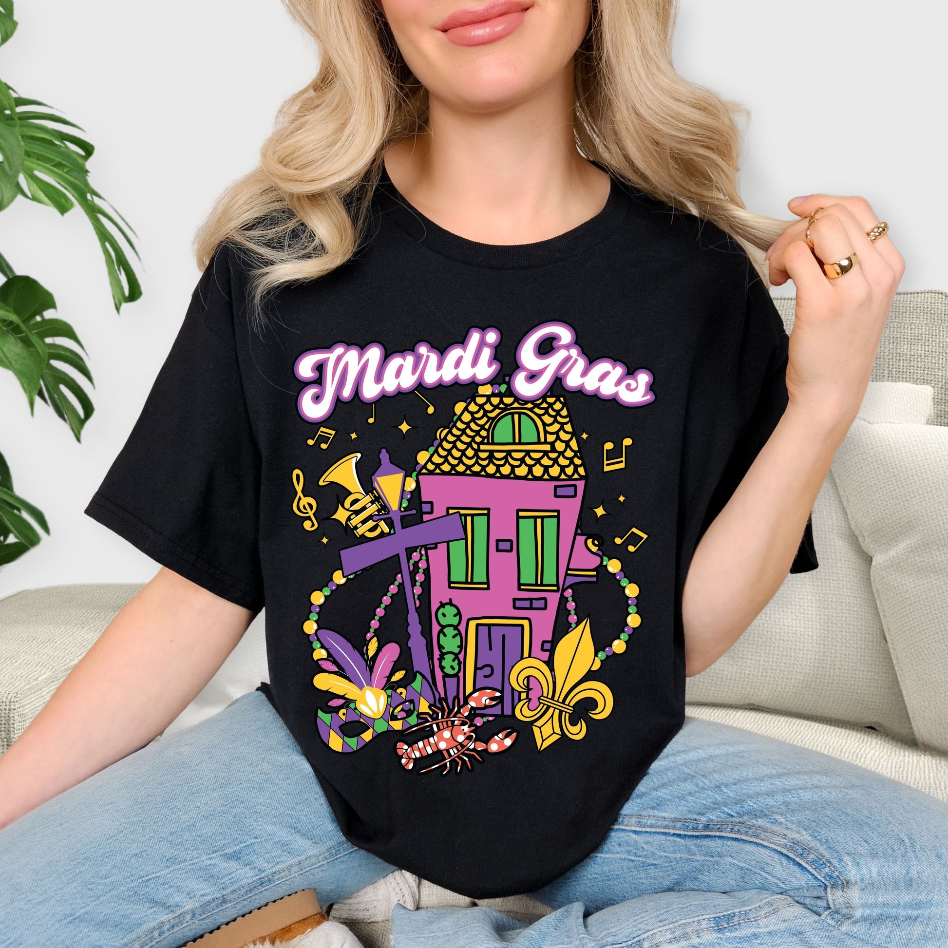 Celebrate the spirit of Mardi Gras with this fun, colorful, and eye-catching graphic tee designed for parade lovers, party queens, and festival vibes. Featuring a vibrant illustration of a Mardi Gras, this shirt perfectly captures the playful energy of carnival season. Designed for comfort and style, this tee pairs effortlessly with jeans, shorts, or layered festival looks.
