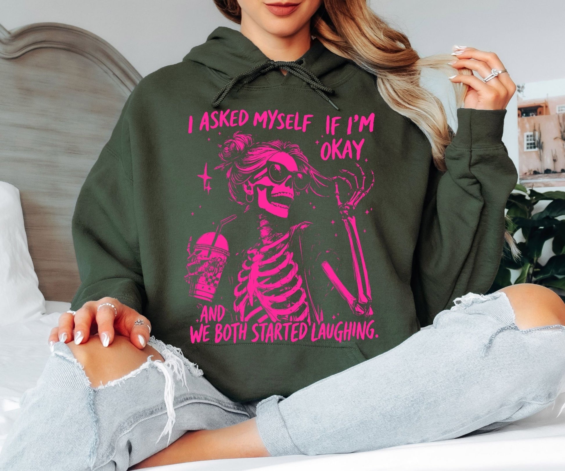 I Asked If I’m Okay Hoodie – Funny Skeleton Illustration, Dark Humor Vibes