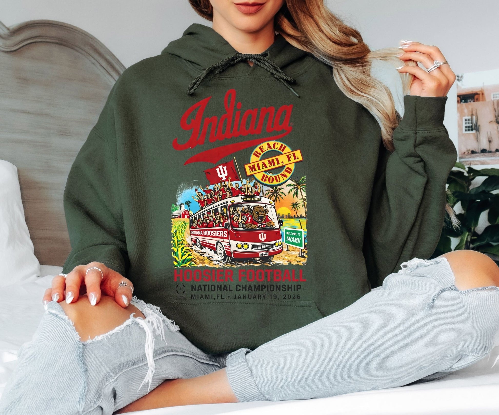 Celebrate Hoosier pride with this bold Indiana football hoodie inspired by the excitement of the national championship journey and Miami Bowl vibes. Featuring a colorful, vintage-style illustration, this design captures the energy of college football, travel, and team spirit in a fun and nostalgic way. Perfect for game days, tailgates, watch parties, or everyday casual wear. A must-have hoodie for Indiana fans, alumni, and college football lovers who want to show their team pride in style.