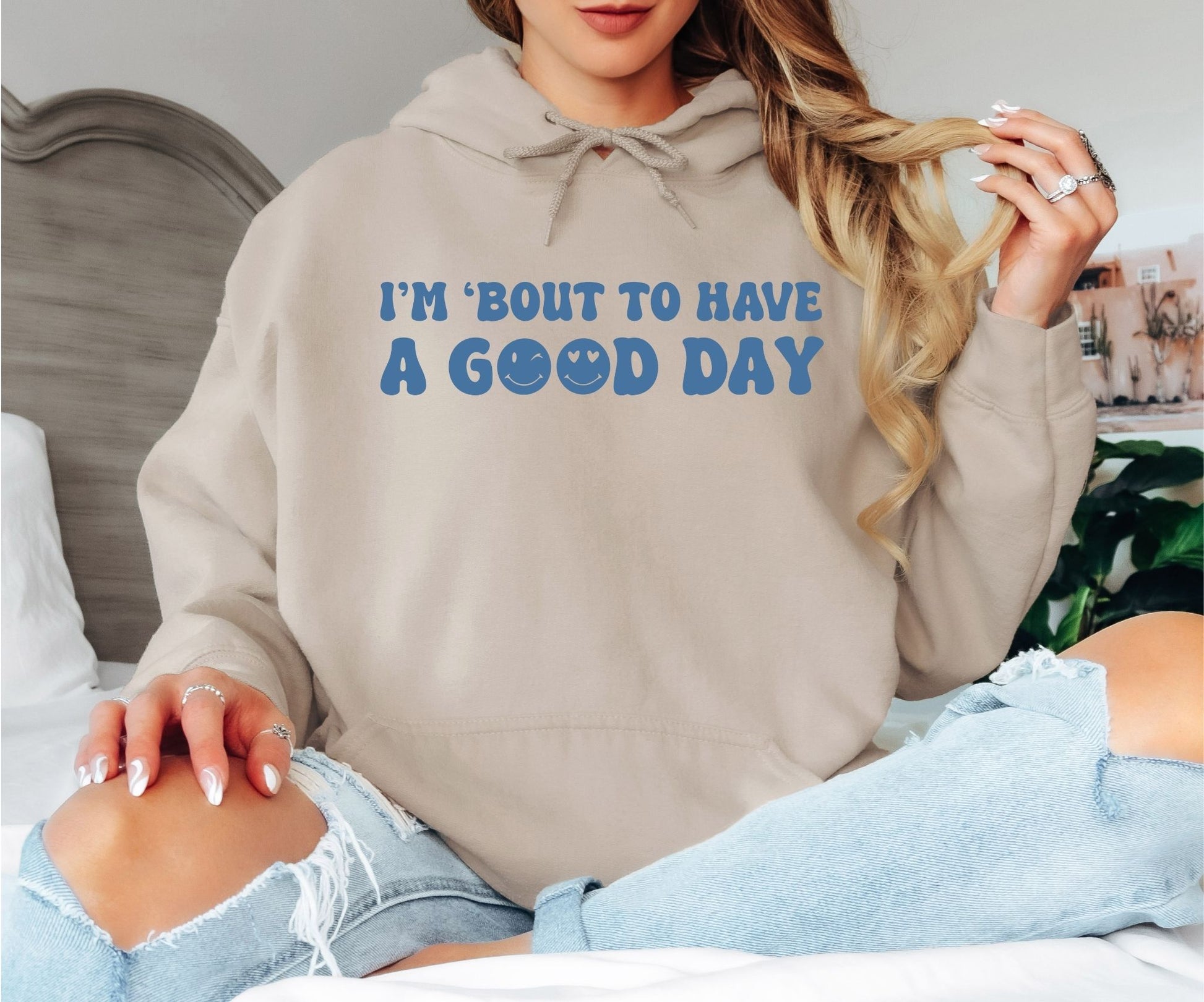 I’m ’Bout to Have a Good Day Hoodie, Smiley Face Text Hoodie, Positive Vibes Unisex Hoodie