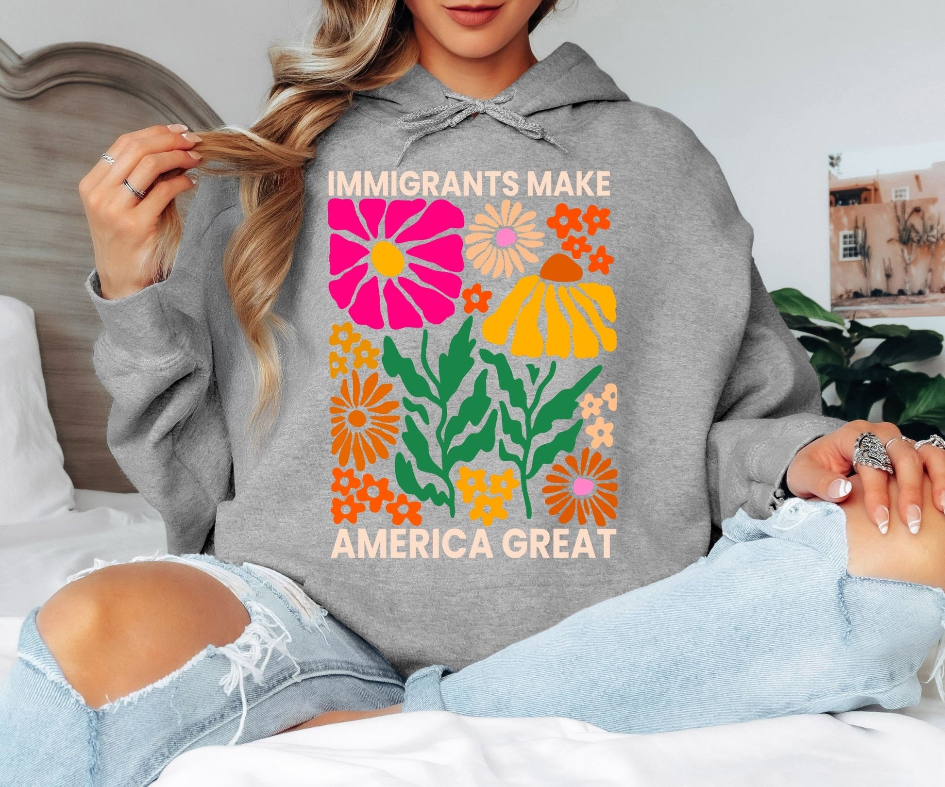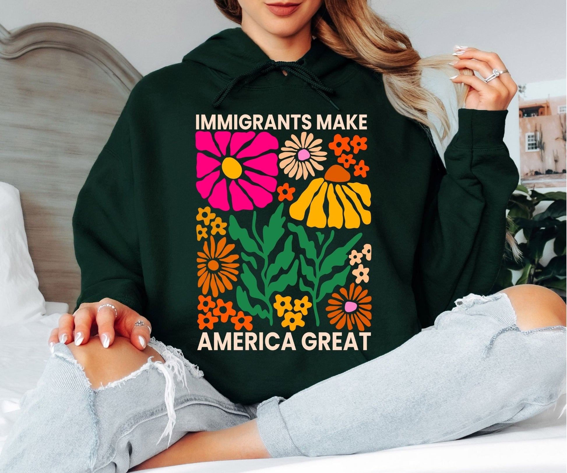 Immigrants Make America Great Hoodie - Retro Floral Graphic Hooded Sweatshirt, Colorful Boho Flower Power Pullover, Social Justice Statement Hoodie, Groovy Botanical Aesthetic Gift