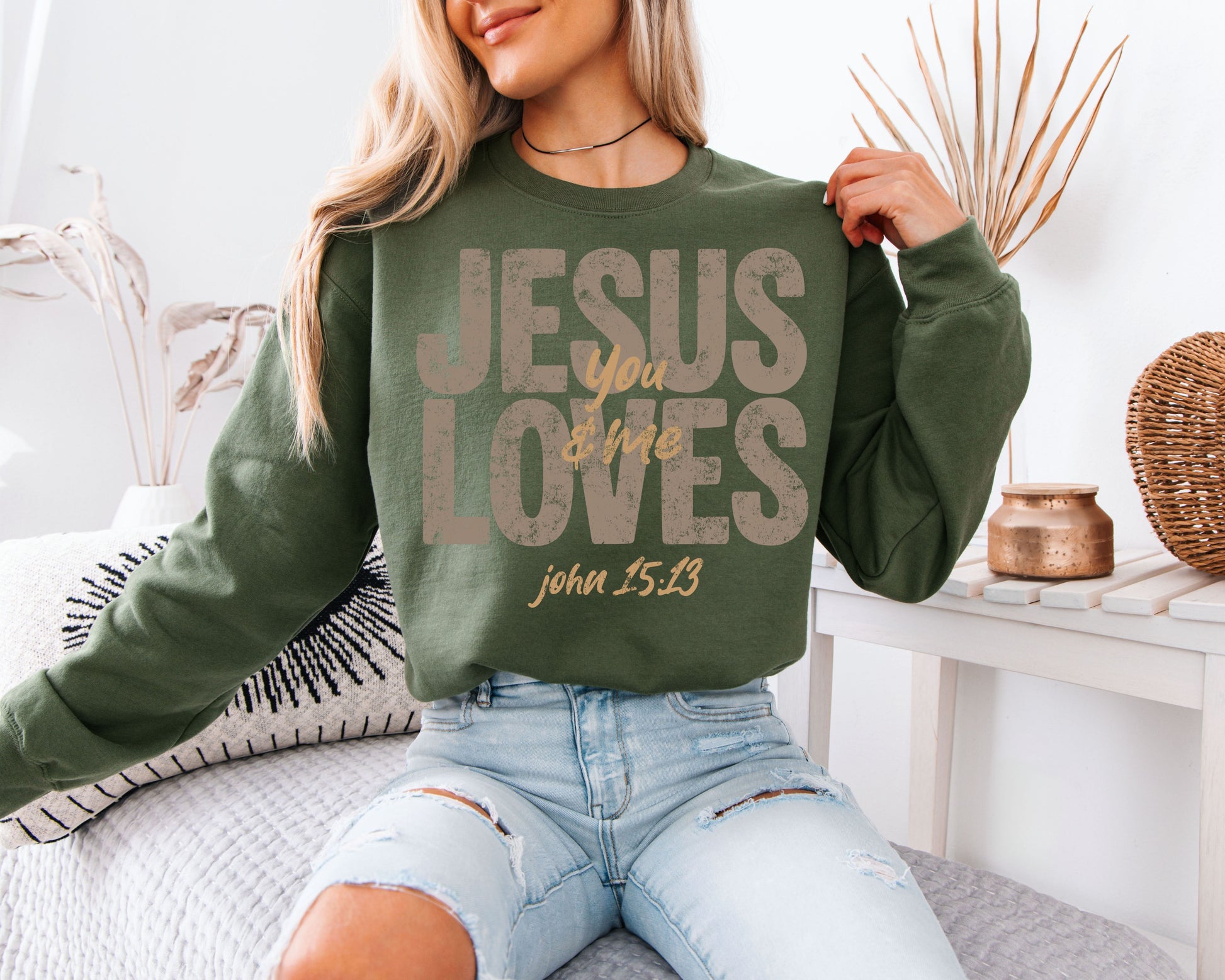 Jesus Loves You & Me Sweatshirt | John 15:13 Bible Verse Crewneck | Distressed Neutral Christian Gift