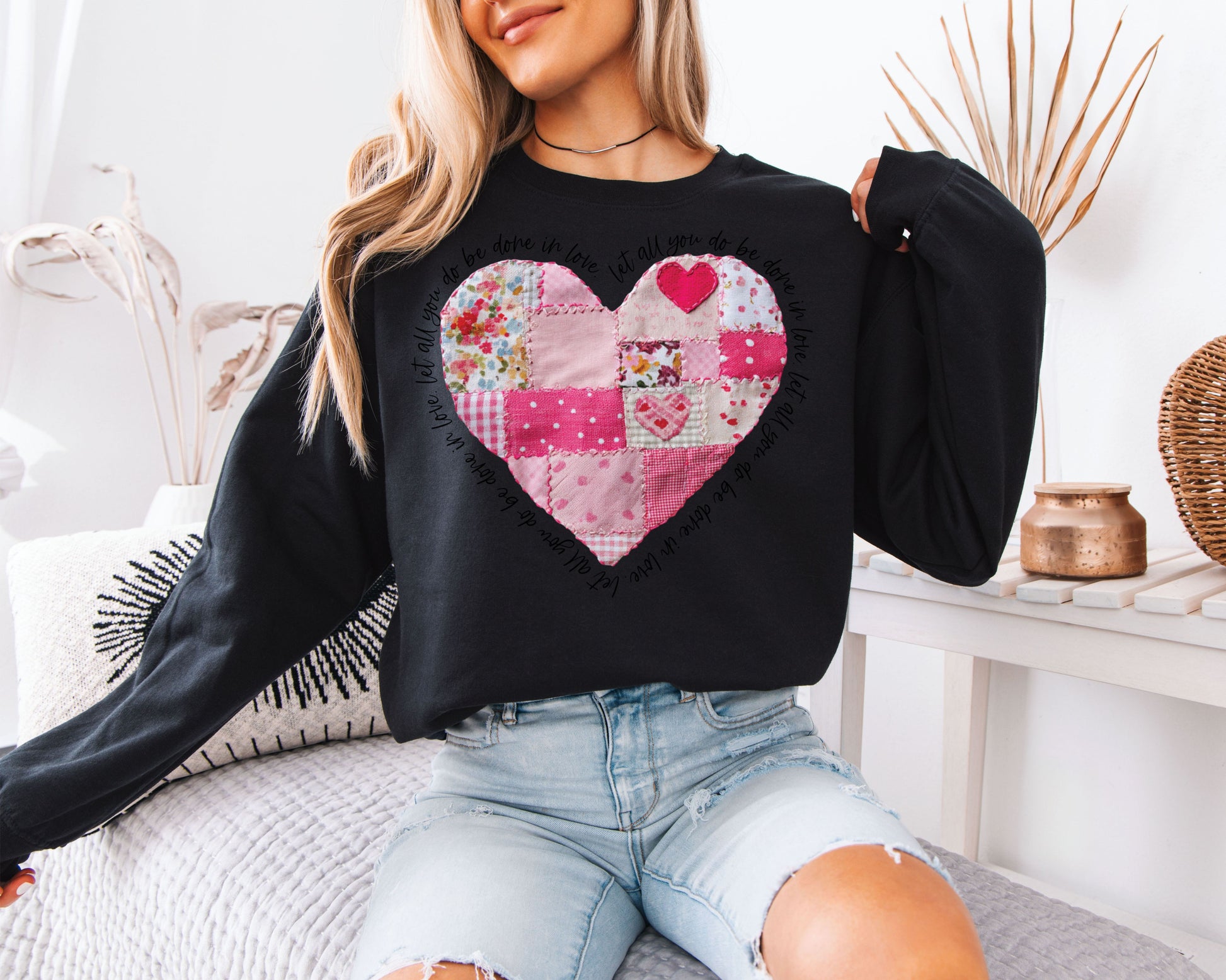 Let All That You Do Be Done In Love Sweatshirt | Cute Patchwork Quilt Heart Crewneck | Cottagecore Christian Gift