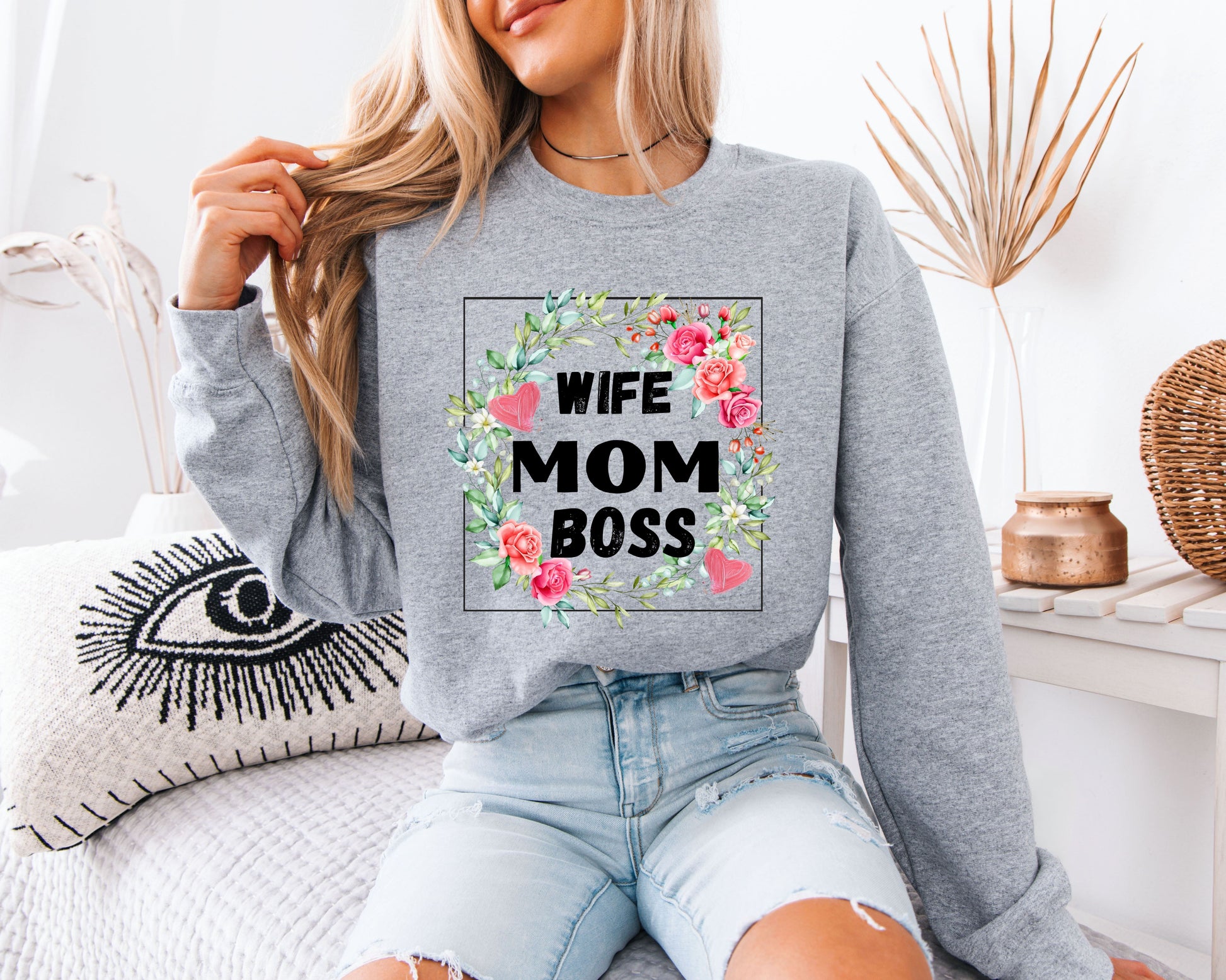 Wife Mom Boss Floral Sweatshirt, Cute Mama Graphic Crewneck Pullover, Strong Mom Life Shirt, Mother’s Day Gift for Her, Cozy Everyday Sweater