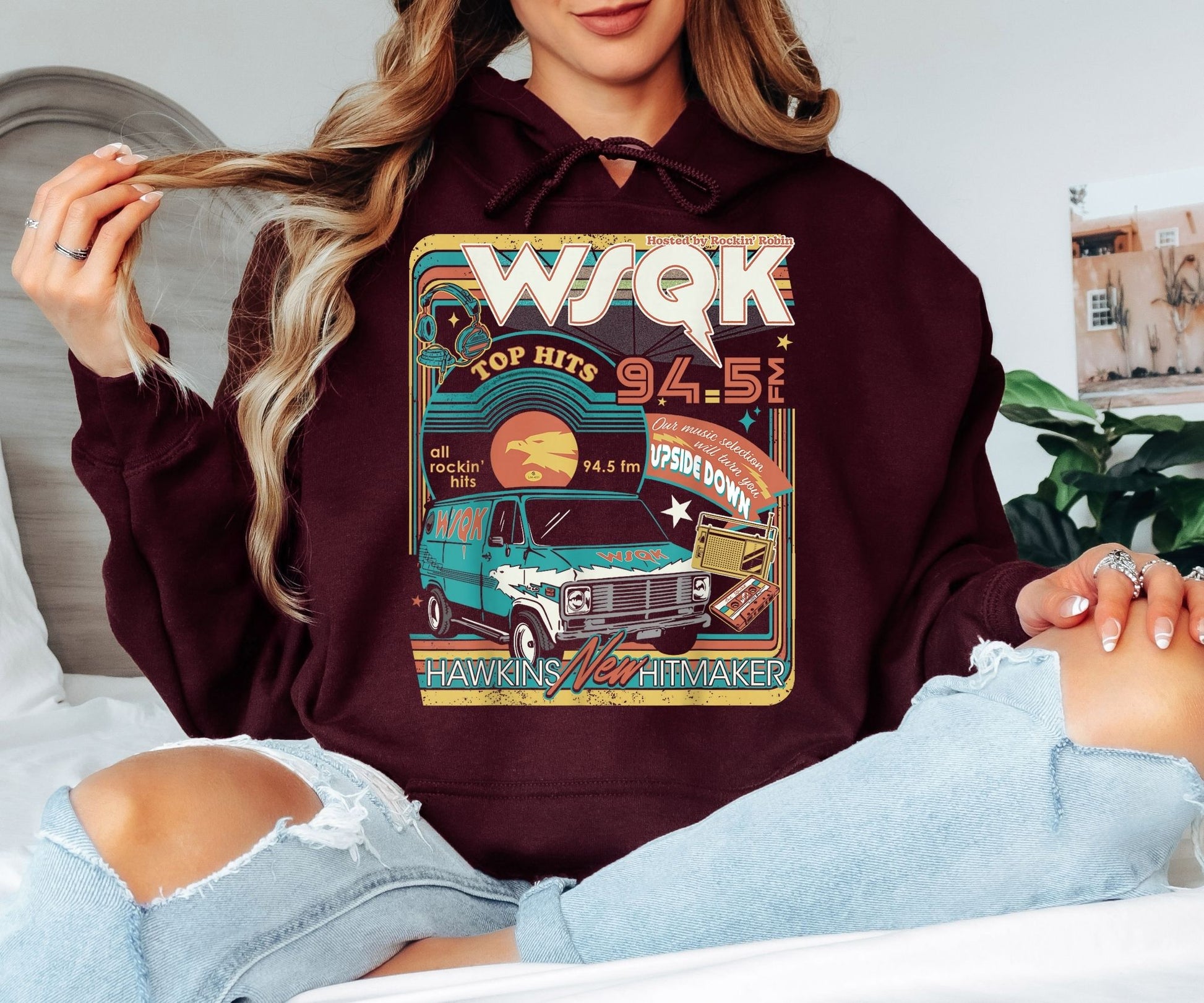 WSQK 94.5 FM Hawkins Hoodie – Stranger Things Inspired Retro Radio Hoodie, Vintage 80s Van Graphic, Unisex Cozy Sweatshirt